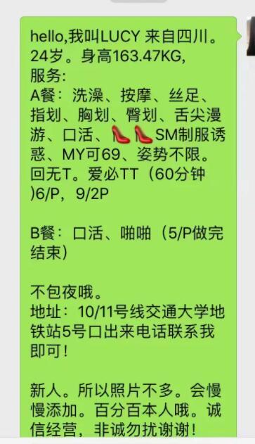 【寻欢细节】:一说交通位置:地址还是比较方便的,地铁出来后,1分钟就到小区门口了,而且就算需要等待也不会无聊枯燥。交 大地域,来来往往养眼美女多的一B,就算提前热身了,毕竟马上我要“上阵杀敌“。 二说妹纸条件:妹纸是川妹子,身材很辣,细腰长腿翘臀,唯一不足我觉得就是不够凶。 三说战场条件:战场条件比较一般,甚至可以说破旧,很老的公寓楼,两室一厅(和小姐妹租住,小姐妹有姐妹篇的,酝酿ing),但 小区门口保安不问的,进出很随意。但老小区停车位很紧张,而且你一旦停车,保安就会问东问西了,建议停到隔壁小区或者商铺上 街沿。我一般停在小区西侧200米远的一个商城停车场,保安上来,先来根烟,再主动交20元,说来办事的,临时停车牌放好,保安 一般会很识趣的让你停在不影响出入的,不然直接问你收费40元。 四说服务,妹纸的服务是有A面和B面的,当然战场条件限制,没有YYY的。本人也不太会描述如何写服务,有MY,AM,抓痒,KJ等, 其他如69,KISS的,应该是看个人魅力的。总之服务蛮多的,物有所值吧。 五来总结: 妹纸是个好妹纸,已经是我长期的喝茶聊天对象。论颜值,也算很高了,即使是素颜,我见过妹纸刚起床,我就到房间等她了,素颜 和妆后差别不大,毕竟妹纸说不喜欢化浓妆,简单弄下就好了。论身材,那更没话说了,之前就说了,细腰翘臀长腿,看果体效果更 是完美,就是不够凶啊,不然就是尤物级别了。论服务,妹纸半路出家的,服务水平毕竟达不到IOS9001标准,但胜在用心和细心。 总的来说,重在感觉,享在服务,触在身形。 【附带照片】: