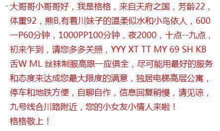【寻欢时间】:2019年6月8日 【寻欢地点】:省份、城市(大概位置) 【信息来源】:狼友推荐、论坛、亲身体验 【服务项目】:鸳鸯浴,漫游,胸推,69式,冰火,口活,爱爱、SM(可选,勿必填写真实服务项目) 【妹妹数量】:1 【环境设备】: 【营业时间】: 【价格一览】:600P、1000PP 2000夜 【安全评估】:评分100 【服务星级】:★★★★ 【重点推荐】:最值得推荐的地方以供参考 【联系方式】: [unfree]wx:QAQ-1133[/unfree] 【寻欢细节】:小黄文不太会写,图片里有妹子的自我介绍喜欢的不容错过啊,妹子最近两天要回家,下次回来估计要月底了。 【附带照片】: