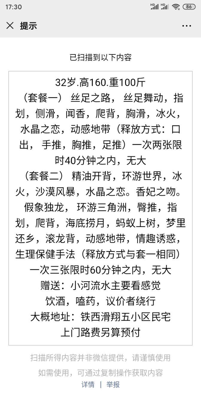 [xinxitop]提示信息[/xinxitop] 【寻欢时间】:2019年12月 【寻欢地点】:沈阳、铁西 【信息来源】:狼友推荐、论坛、亲身体验 【服务项目】:看图片 【妹妹数量】:1 【环境设备】:一般 【营业时间】:约上就行 【价格一览】:200 300 【安全评估】:评分,满分100。 【服务星级】:★★★★★(最高5星)应适当评价质量 【重点推荐】:最值得推荐的地方以供参考 【联系方式】:[unfree]微信:a15640259892 QQ:2731762858[/unfree] 【寻欢细节】:身材可以,样子一般吧,服务不错,足钟,口活很好 【附带照片】: