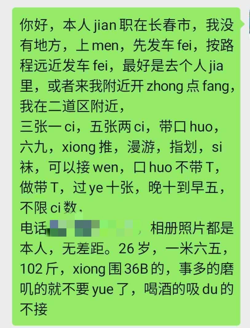 [xinxitop]提示信息[/xinxitop] 【寻欢时间】:2020年5月15日 【寻欢地点】:吉林省长春市 【信息来源】:亲身体验 【服务项目】:漫游,胸推,69式,口活,爱爱,丝袜 【妹妹数量】:1 【环境设备】:上门家里 【营业时间】:应当是全天,没问 【价格一览】:300/次;500 两次;1000 包夜(22:00-5:00)妹子要晨跑 【安全评估】:100 【服务星级】:★★★★ 【重点推荐】:水多,叫声太骚了 【联系方式】:[unfree]WX:a13634402404[/unfree] 【寻欢细节】:定的包夜,需要提前订时间,交了 100 的定金。约妹子吃了个饭,提前约了出来,哈哈,机智如我,多享受了 2 个多小时。妹子和照片上比,皮肤差点,样子没啥变化。性格蛮直爽的,喝了几罐啤酒,主动邀上床。用跳蛋挑逗了一会就变得湿漉漉的了,妹子还拍了一小段未露脸的视频,叫声大的我都怕隔壁找过来。喝了酒,时间长了些,给妹子弄喷了,可惜当时趴着干,没欣赏到,可惜。一炮后,妹子累了,睡了过去,半夜摸摸搜搜的把妹子惊醒了,又干了一炮。 【附带照片】: