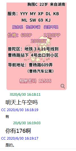 [xinxitop]提示信息[/xinxitop] 为了鼓励会员积极回复验证,只要原帖没聊天截图的,参与验证回复聊天截图都奖励100金币。 【寻欢时间】:2020年7月20日 【寻欢地点】:上海曹杨路附近 【信息来源】:亲身体验 【服务项目】:鸳鸯浴,漫游,胸推,口活,爱爱 【妹妹数量】:好像合租 【环境设备】:还行 【营业时间】:10开始吧 【价格一览】:600/次或1100/pp等 【安全评估】:评分,满分100。 【服务星级】:★★★★★ 【重点推荐】:长腿大胸,长得也不错,还不够吗? 【联系方式】:[unfree]QQ:2901140253[/unfree] 【寻欢细节】:妹子应该是来上海不久,买的别人的Q号,我还寻思Q怎么换人了。细节不多写了,反正三点,腿超长,熊超大,人超美。服务也不错。 【附带照片】: