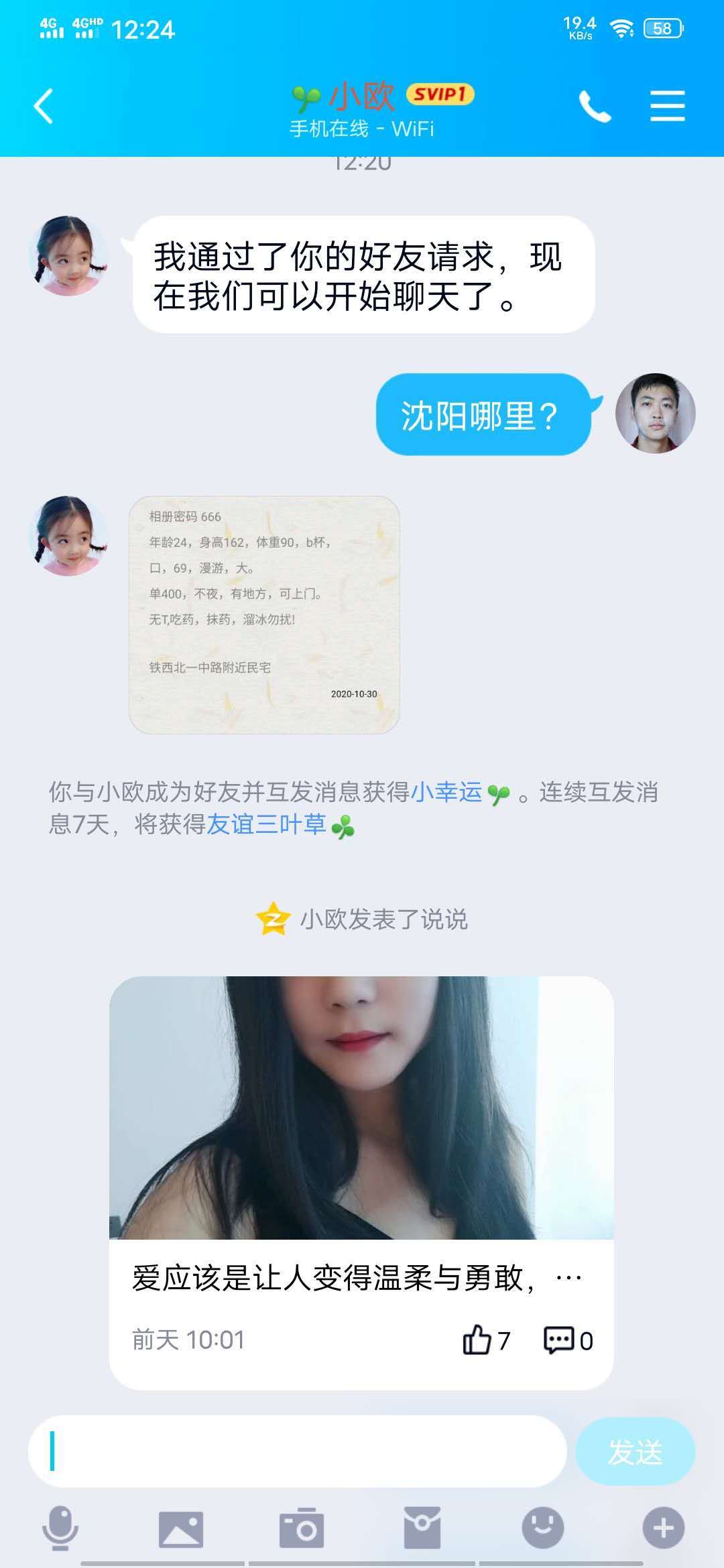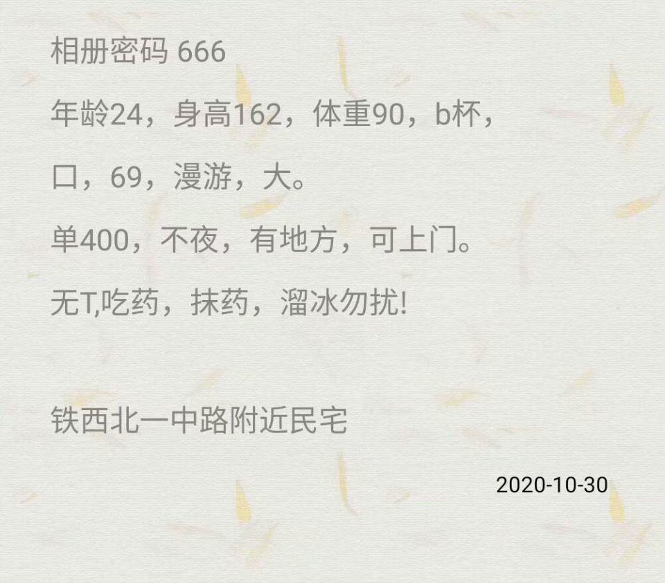 [xinxitop]提示信息[/xinxitop] 【寻欢时间】:20XX年10月31日 【寻欢地点】:辽宁省份、沈阳城市(大概位置) 【信息来源】:亲身体验 【服务项目】:69式,口活,爱爱、 【妹妹数量】:1 【环境设备】:100 【营业时间】:白天 【价格一览】:400/次 【安全评估】:评分,满分100。 【服务星级】:★★★★★(最高5星)应适当评价质量 【重点推荐】:嫩,敏感水超级多 【联系方式】: 为了鼓励会员积极回复验证,只要原帖没聊天截图的,参与验证回复聊天截图都奖励100金币。 【寻欢细节】:妹子非常敏感,非常敏感,水多,一股股的往外淌,一怼一哆嗦。真是挺爽。推荐一波 【附带照片】: