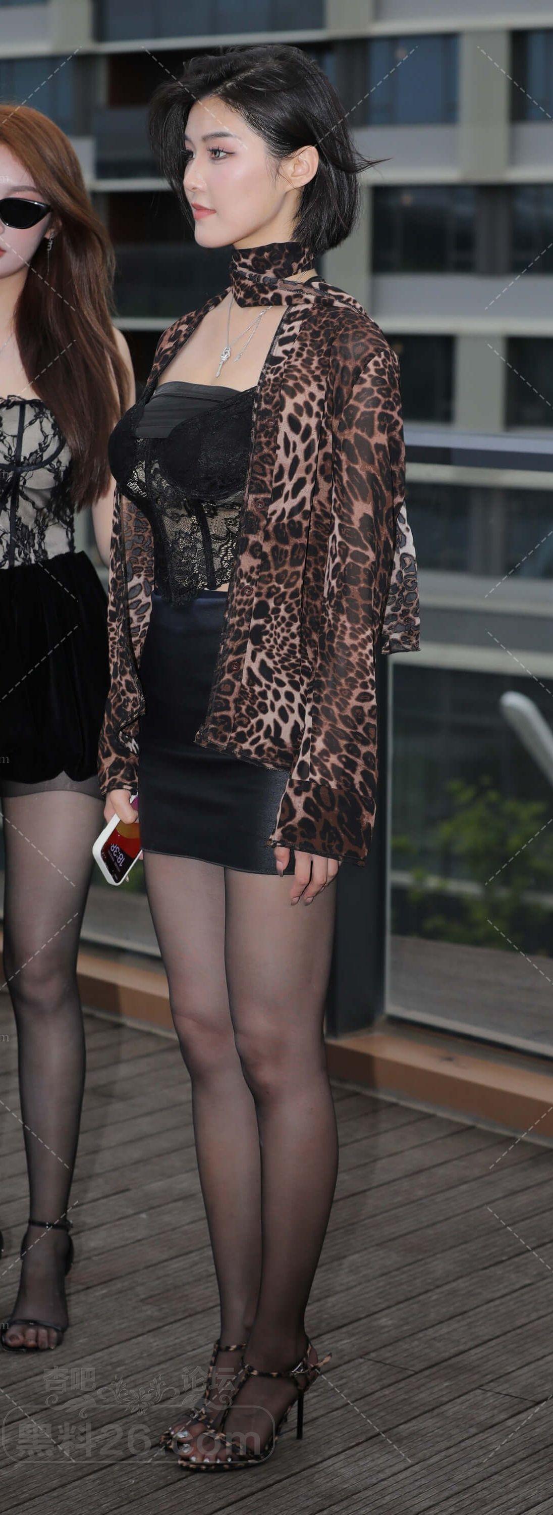 豹纹上衣灰色包臀裙短发美女黑丝袜大长腿吸睛【10P】