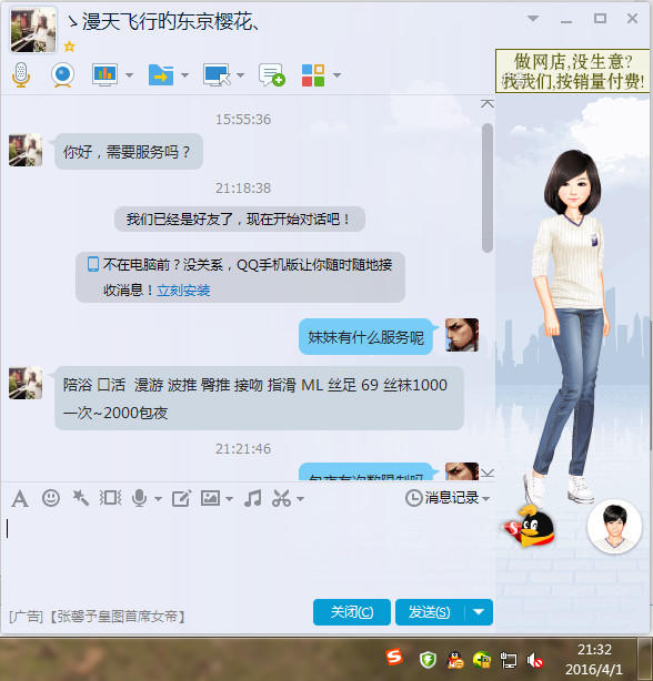 【网友昵称】:雯雯 【网友籍贯】:不清楚 【网友年龄】:21 【工作时间】:整天 【网友外貌】: 气质迷人 火辣身材。 【约会节目】: ML 接吻 洗澡 漫游 69 口交 做AI 肛交 KB 无套做爱 制服 丝袜诱惑 【花费金额】:1000一次 2000包夜 【安全隐患】:必须安全,不安全也不敢推荐了! 【联系方式】: